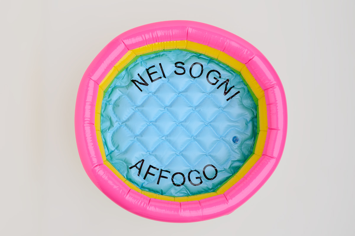 An installation-diary that recounts a shipwreck with no return. Armrests, ballasts, a brightly coloured inflatable pool: objects that should save, but here become witnesses of an ongoing drift. Signs of an illusory buoyancy, an attempt at resistance that does not lead to the shore.